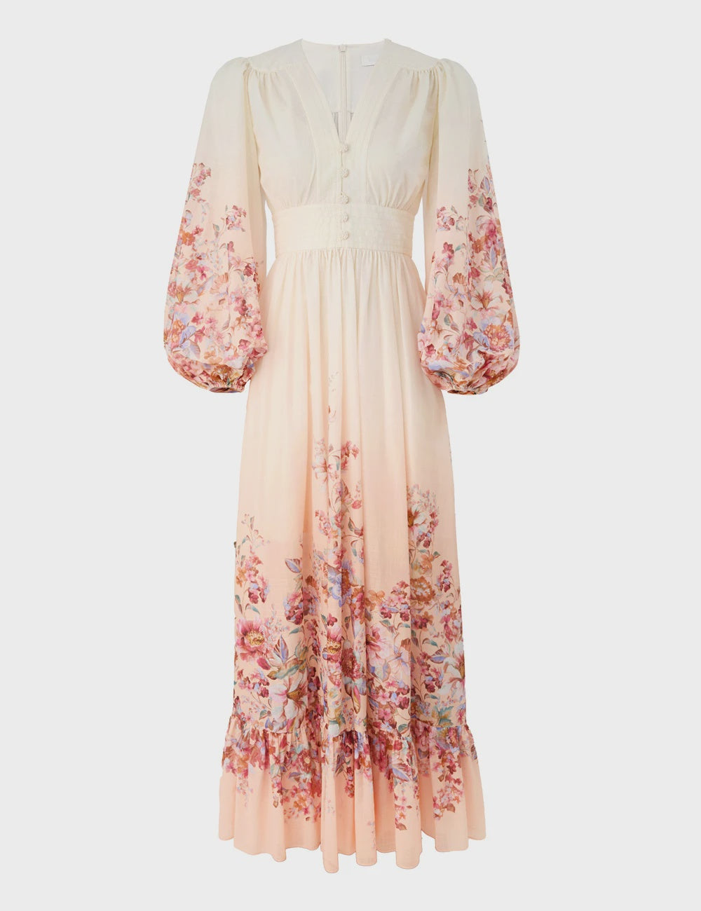 The Awaken Plunge Maxi Dress in Ivory Floral from our Resort Swim 2026 Collection. A cotton maxi dress featuring a plunging V-neckline, long tubular sleeves with elasticated cuffs, finished with a fitted waistband and heavily gathered skirt.