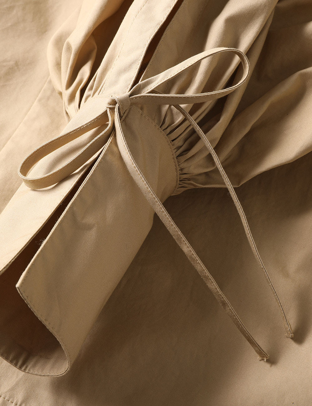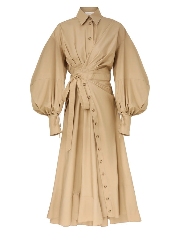 The Rebellion Poplin Midi Dress in Olive from our Cruise 2026 Collection, Twisted Romance. A cotton midi dress featuring a wrap waist belt, long blouson sleeves, buttons down the centre front and heavy gathering throughout.