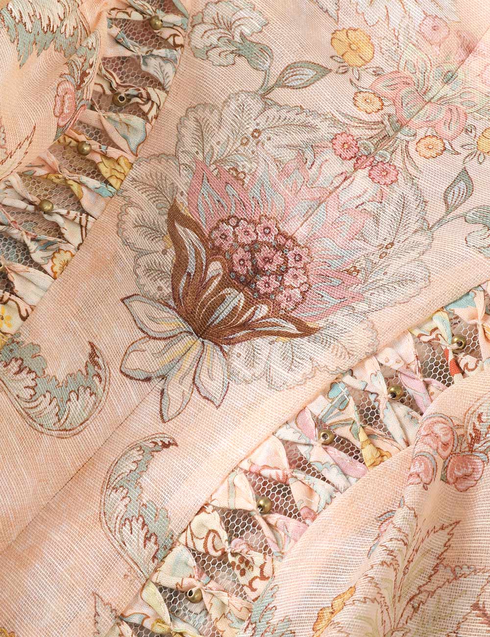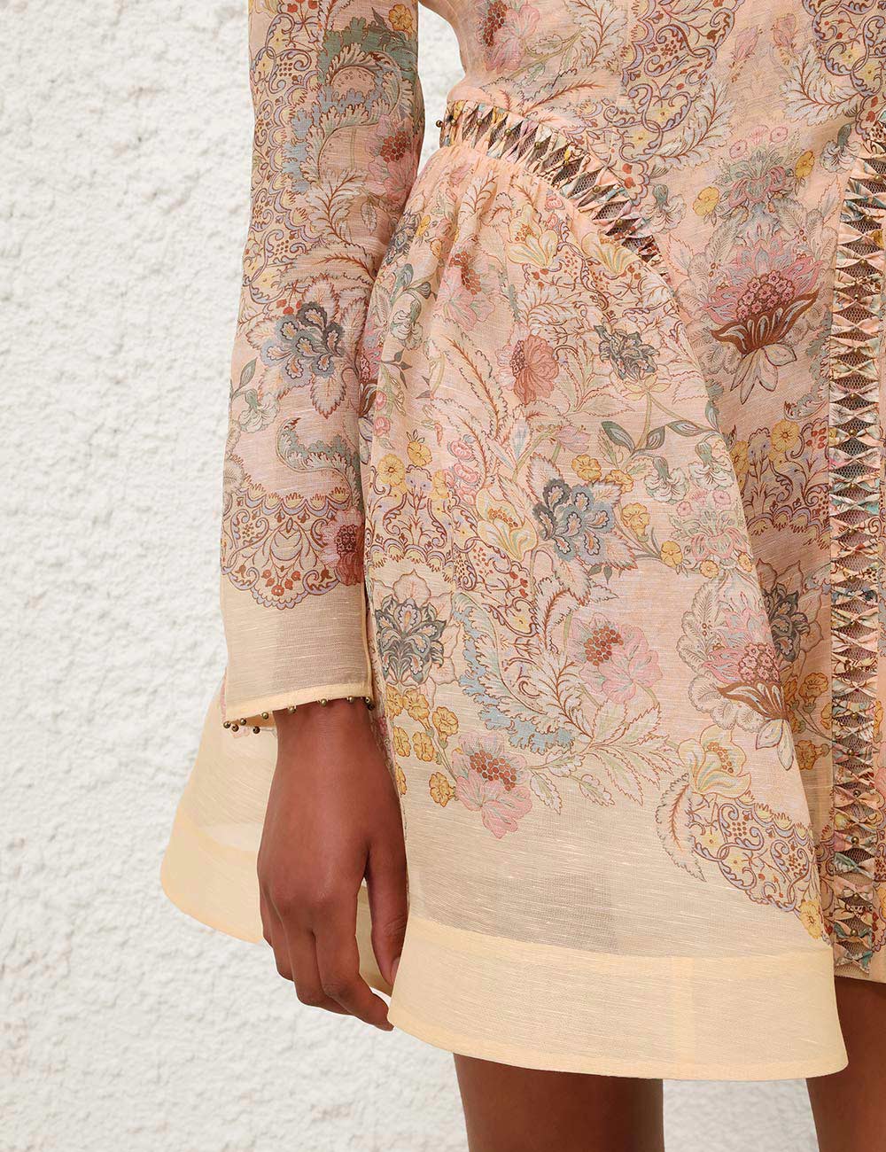 The Rebellion Beaded Mini Dress in Pink Floral from our Cruise 2026 Collection, Twisted Romance. A silk-linen mini dress featuring a stand collar with trim and gold beading, long slim sleeves, a centre back zip closure, and a fully flared skirt.