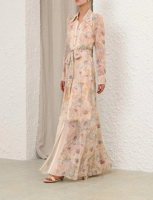 The Rebellion Pussybow Shirt Dress in Pink Floral from our Cruise 2026 Collection, Twisted Romance. A long sleeve maxi dress featuring a classic collar with pussybow necktie and buttons down the centre front.