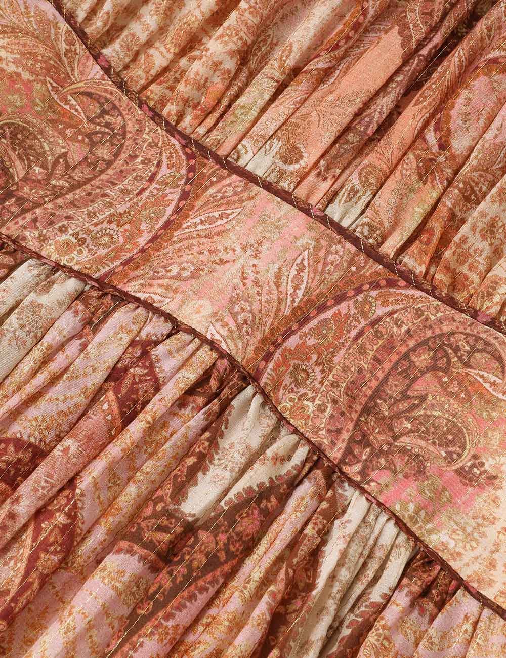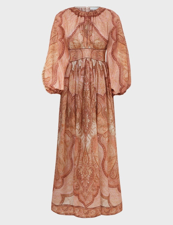 The Wanderlust Long Sleeve Midi in Tapestry Burgundy Multi from our Resort Swim 2026 Collection. A cotton-silk midi dress featuring a round neckline, long billow sleeves with elasticated cuffs, finished with a fitted waistband and heavy gathering throughout.