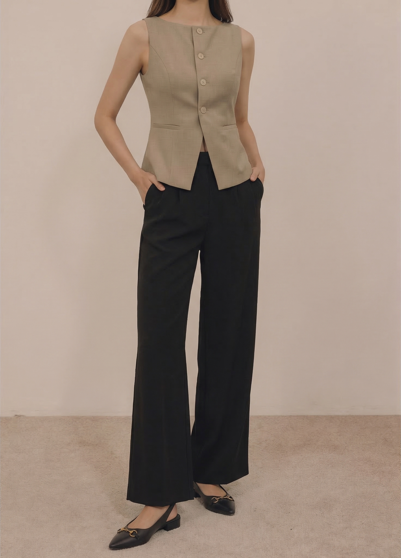 Pairs beautifully with high-waisted tailored trousers, wide-leg pants, pencil skirts, or a structured mini skirt for a polished, modern look.