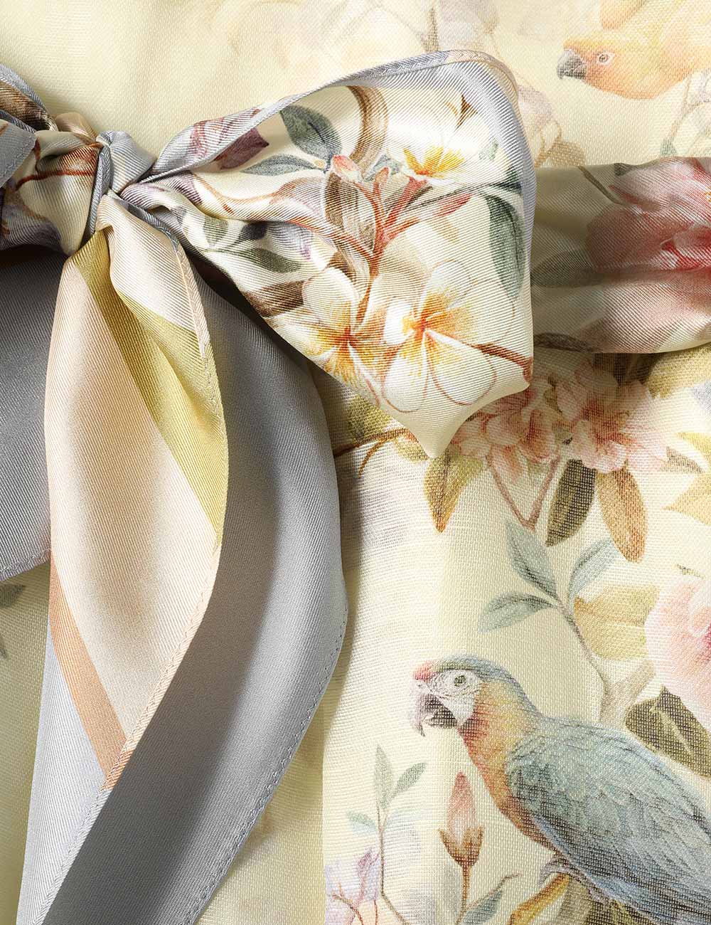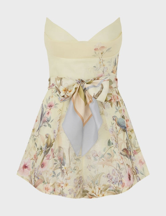 The Rebellion Fitted Playsuit in Lemon Aviary from our Cruise 2026 Collection, Twisted Romance. A silk-linen playsuit featuring a plunging V-neckline, invisible zip closure, finished with a flared hem.