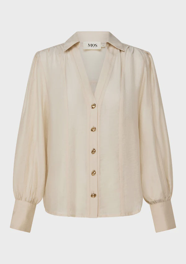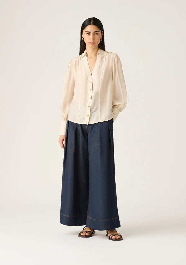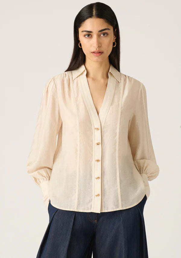 Pairing back seamlessly within your wardrobe, this long sleeve blouse reveals crisp, classic colour in pearl white, accentuated by gleaming gold at the front fastening and cuffs. Designed to offer relaxed, easy shaping within a lightweight linen blend, the blouse appeals further with voluminous blouson sleeves, which frame an open V-neckline set below a sharp shirt collar.