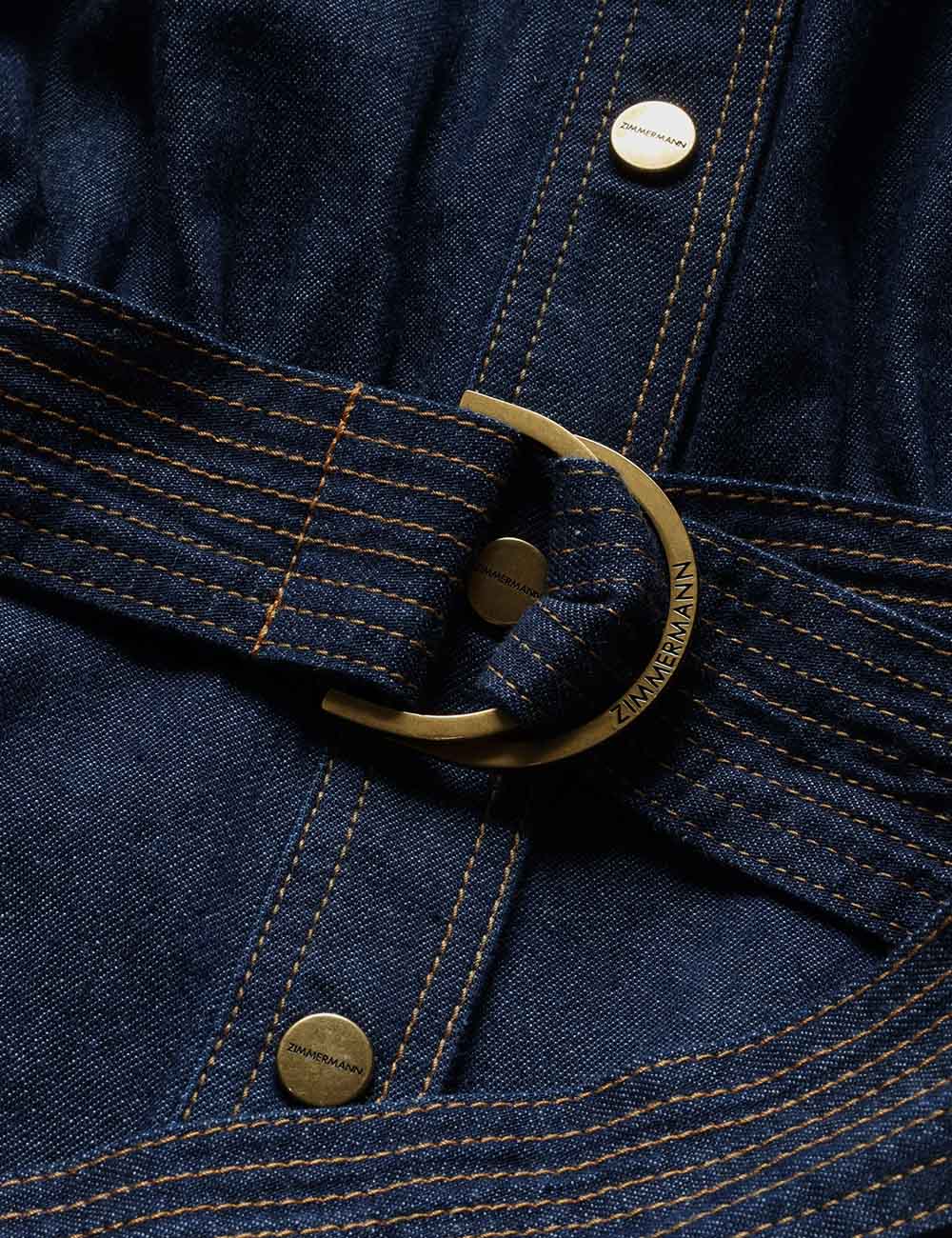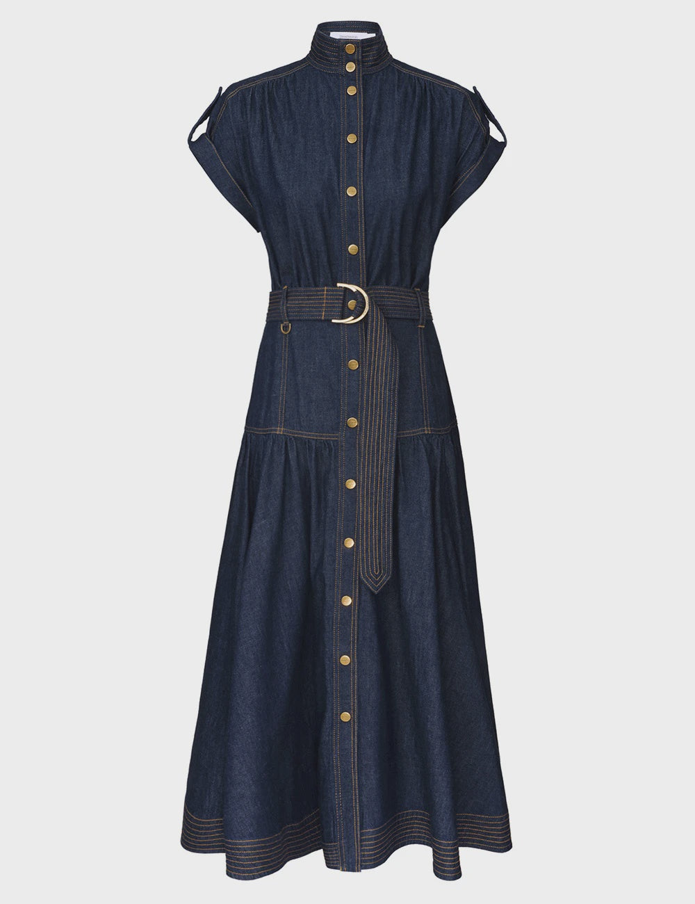 The Denim Midi Dress in Harbour Blue from our Spring 2026 Collection, Kindred Spirit. A denim midi dress featuring a high stand collar, wide sleeves with bar tabs, centre front buttons, finished with a D-ring waist belt and pleated frill skirt.