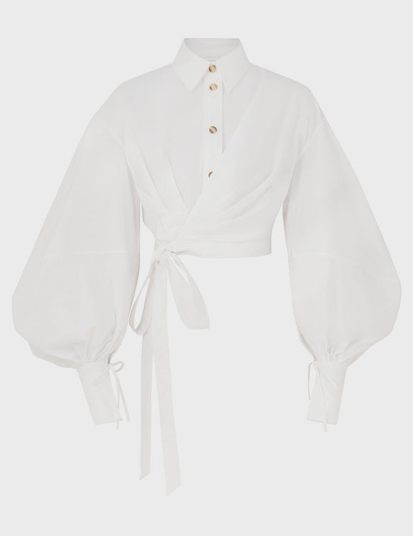 The Rebellion Poplin Wrap Blouse in Ivory from our Cruise 2026 Collection, Twisted Romance. A cotton blouse featuring a classic collar, buttons down the centre front, finished with exaggerated sleeves and a wrap waist belt.
