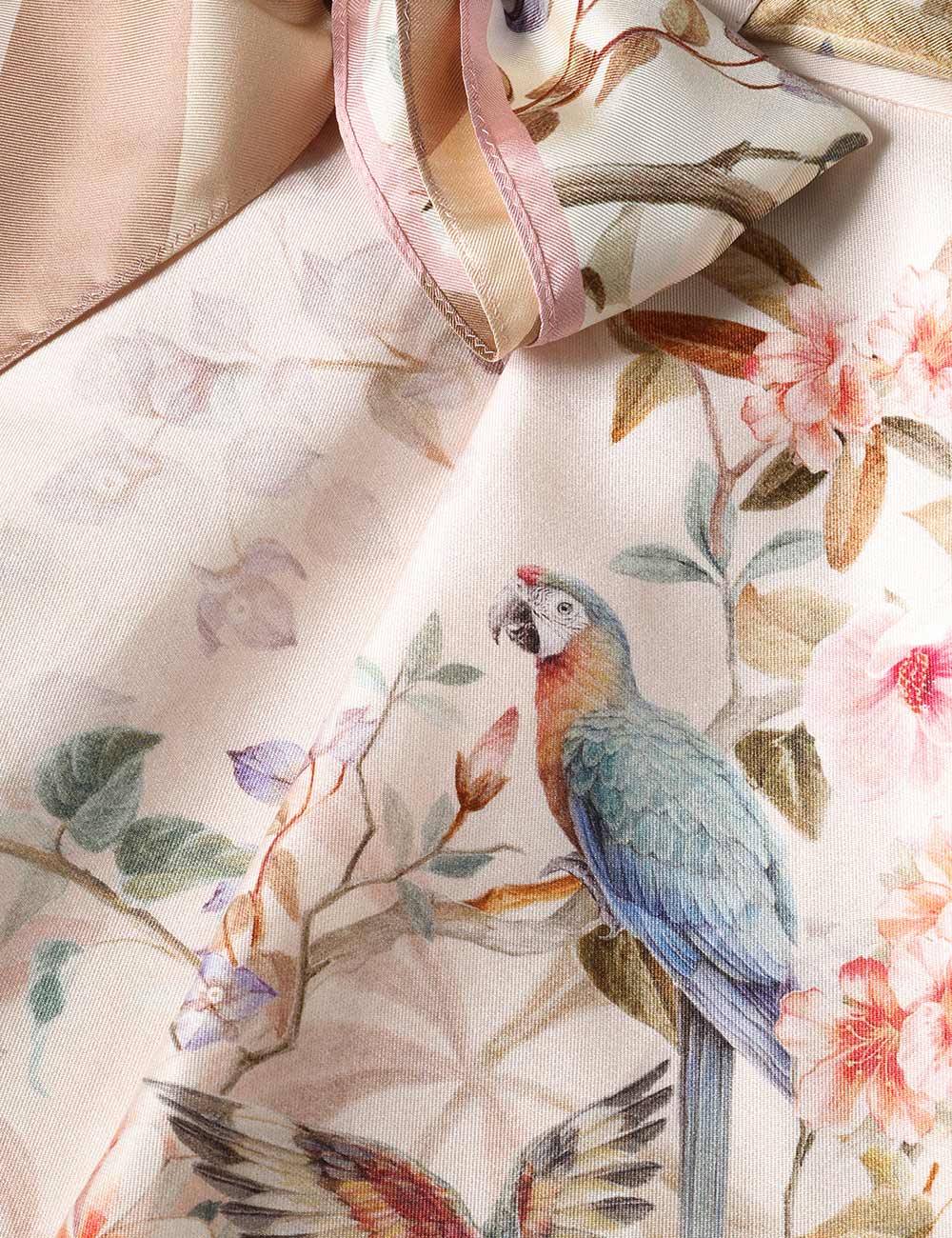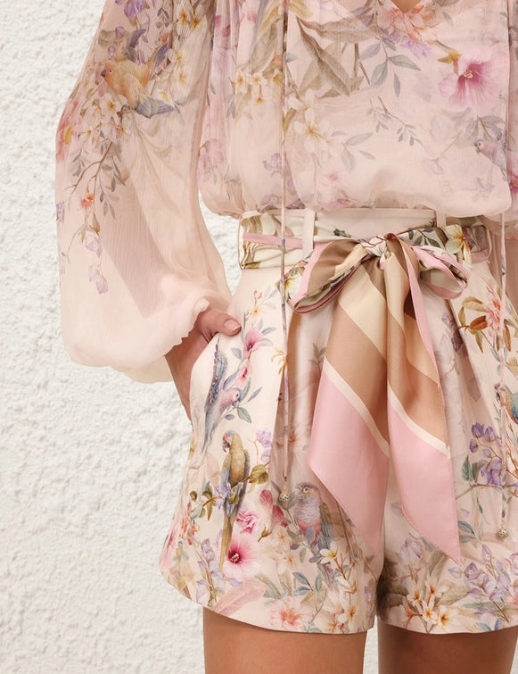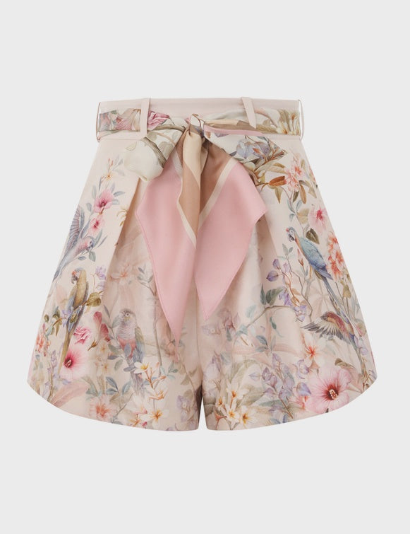 The Rebellion Tuck Short in Cream Aviary from our Cruise 2026 Collection, Twisted Romance. A silk-cotton, mid-rise short featuring a self-tie belt scarf and centre back zip closure.