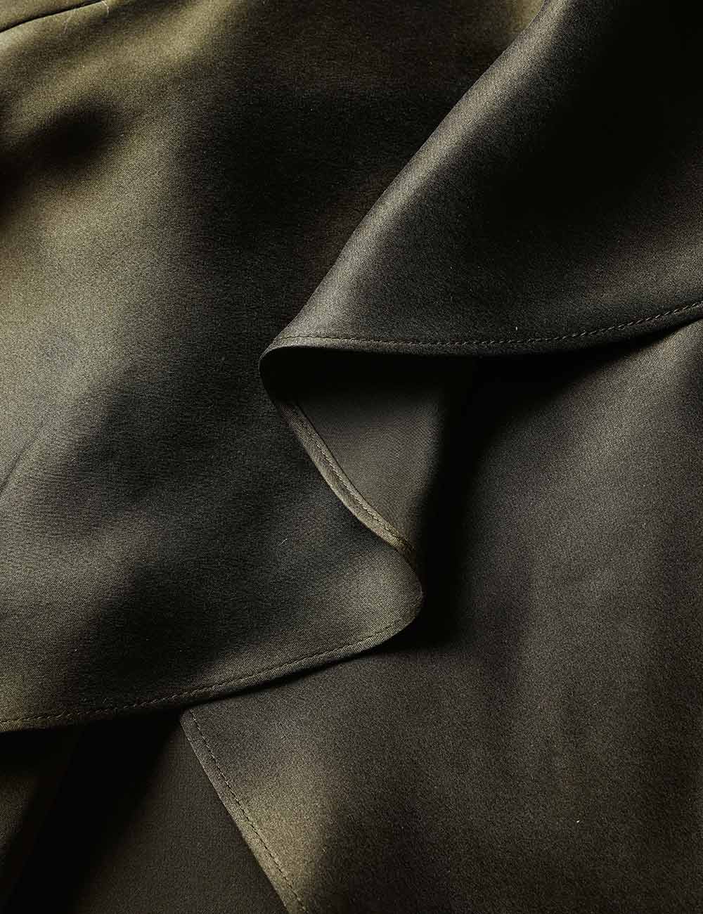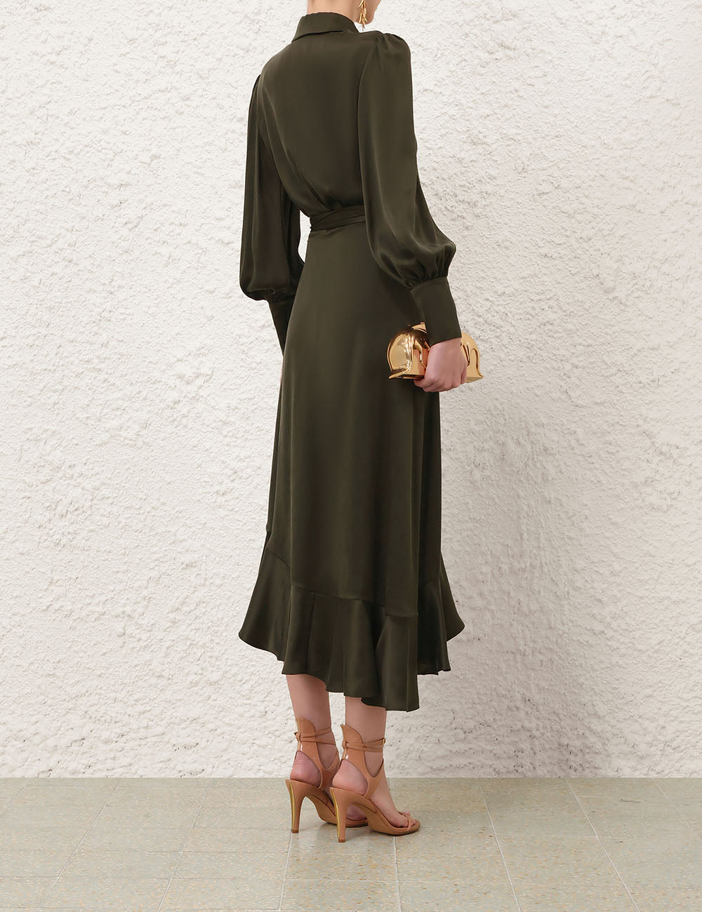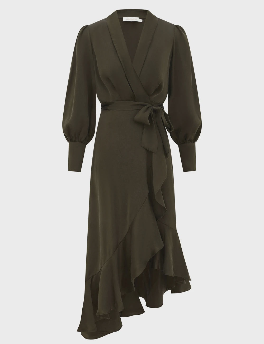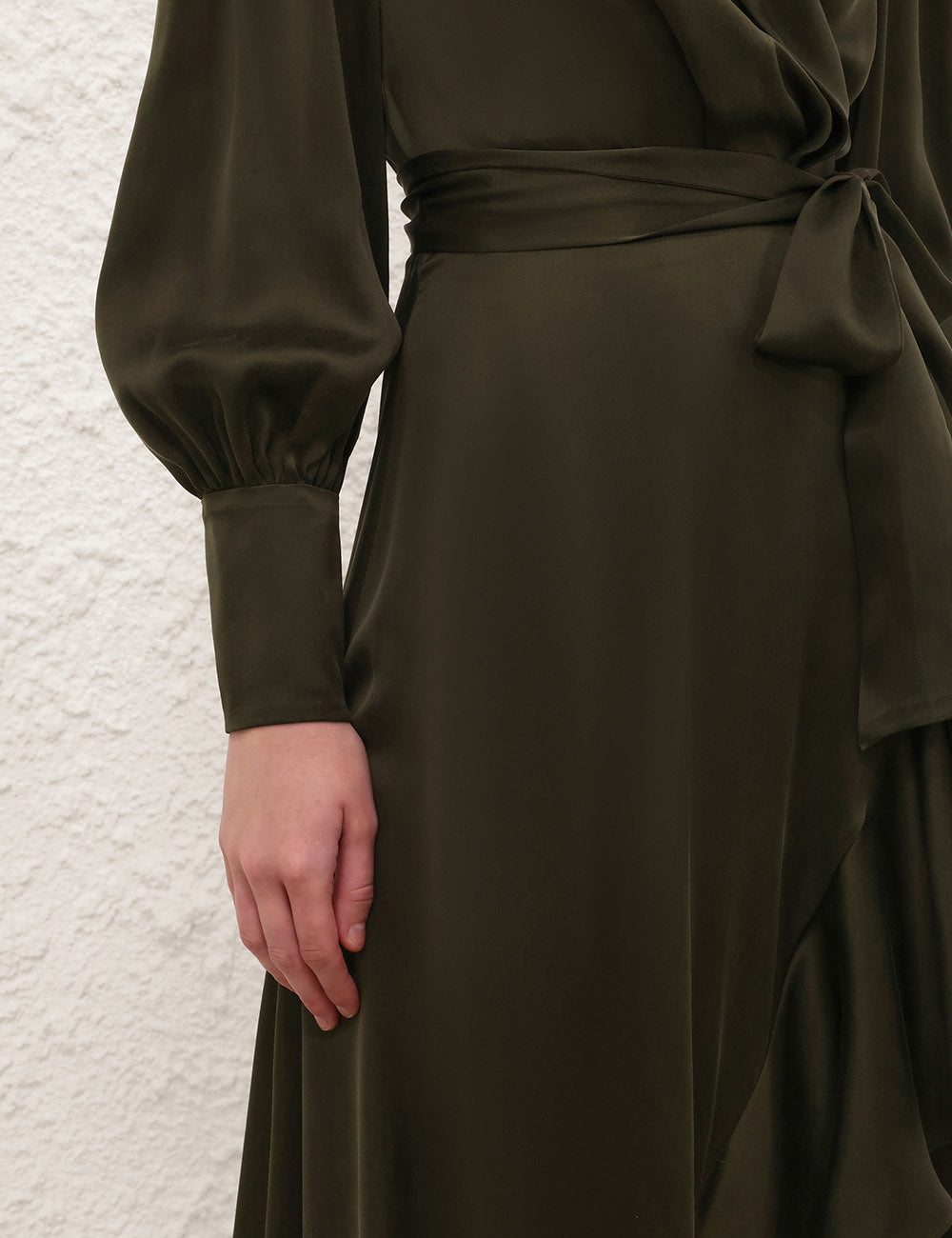 The Silk Wrap Midi Dress in Dark Olive from our Spring 2026 Collection, Kindred Spirit. A silk midi dress featuring a wrap silhouette, fluid asymmetric skirt, plunging V-neckline, finished with elongated cuffs with zip closures.