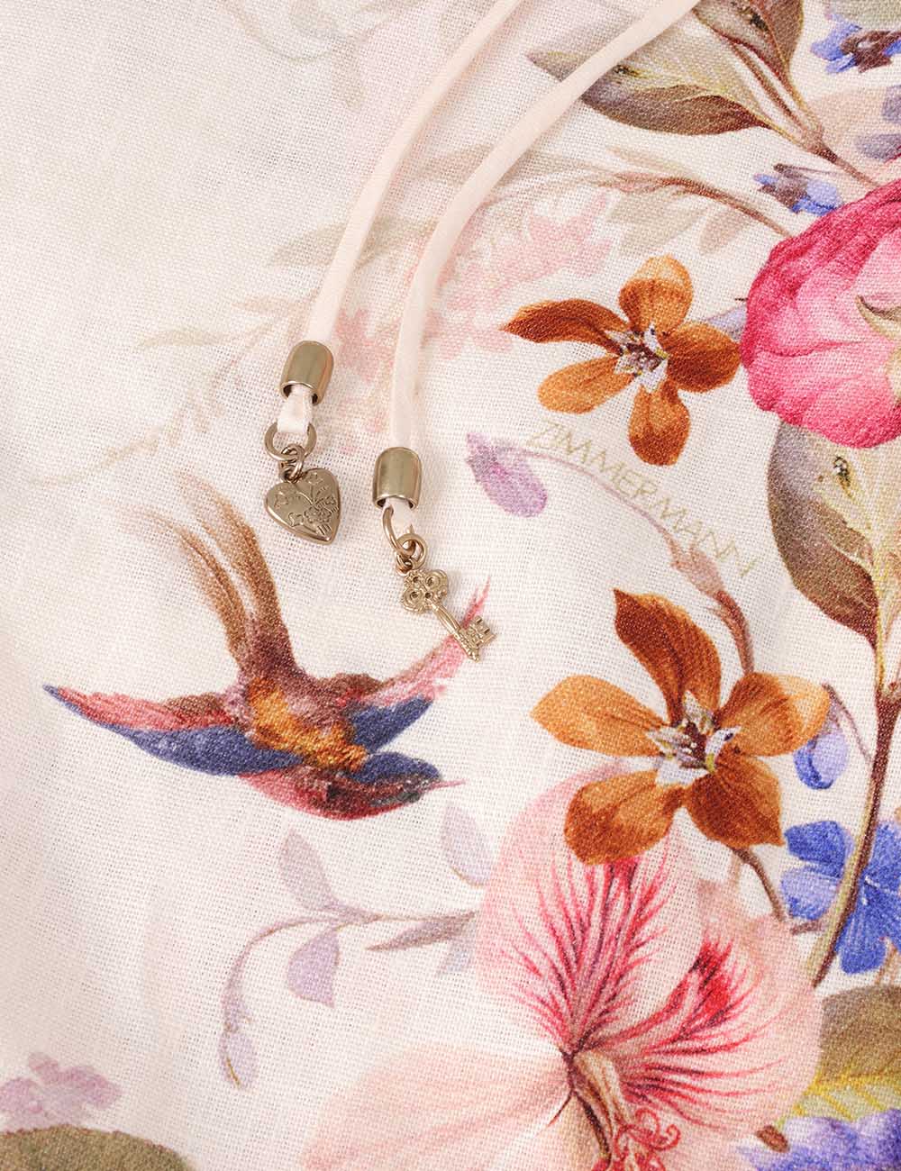 The Patience Frill Midi Dress in Vanilla Floral from our Resort Swim 2026 Collection. A linen midi dress featuring a straight-across neckline with ruffle detailing, criss-cross straps at the back, finished with side skirt splits.