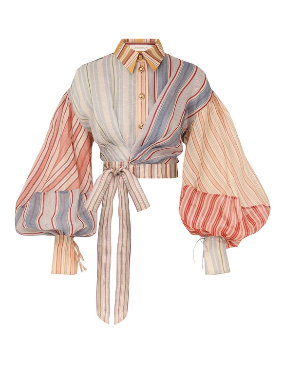 The Rebellion Striped Blouse in Spliced Stripes from our Cruise 2026 Collection, Twisted Romance. A silk-linen blouse featuring a classic collar, buttons down the centre front, long billow sleeves with exaggerated cuffs, finished with a wrap waist belt tied to one side.